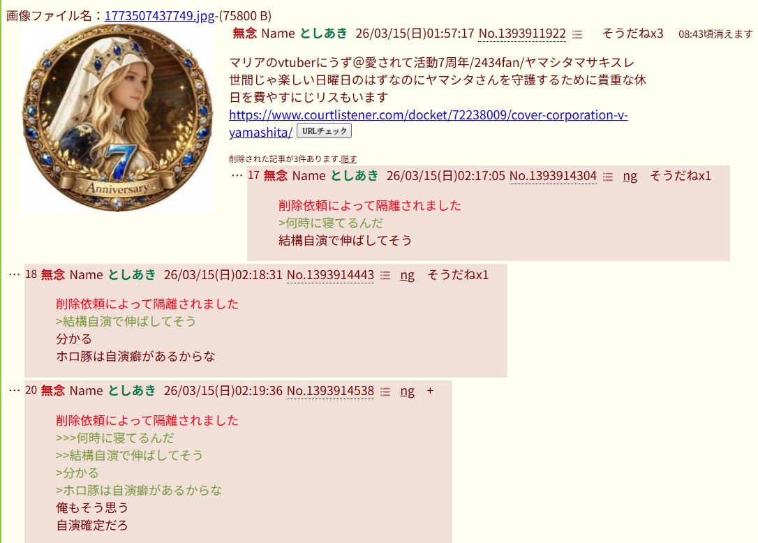 | … | 21126/03/15(日)07:51:01No.1410861905+DMCAはあくまで裁判に至るまでの経緯だからあとは通常の著作権裁判になるだけ |
