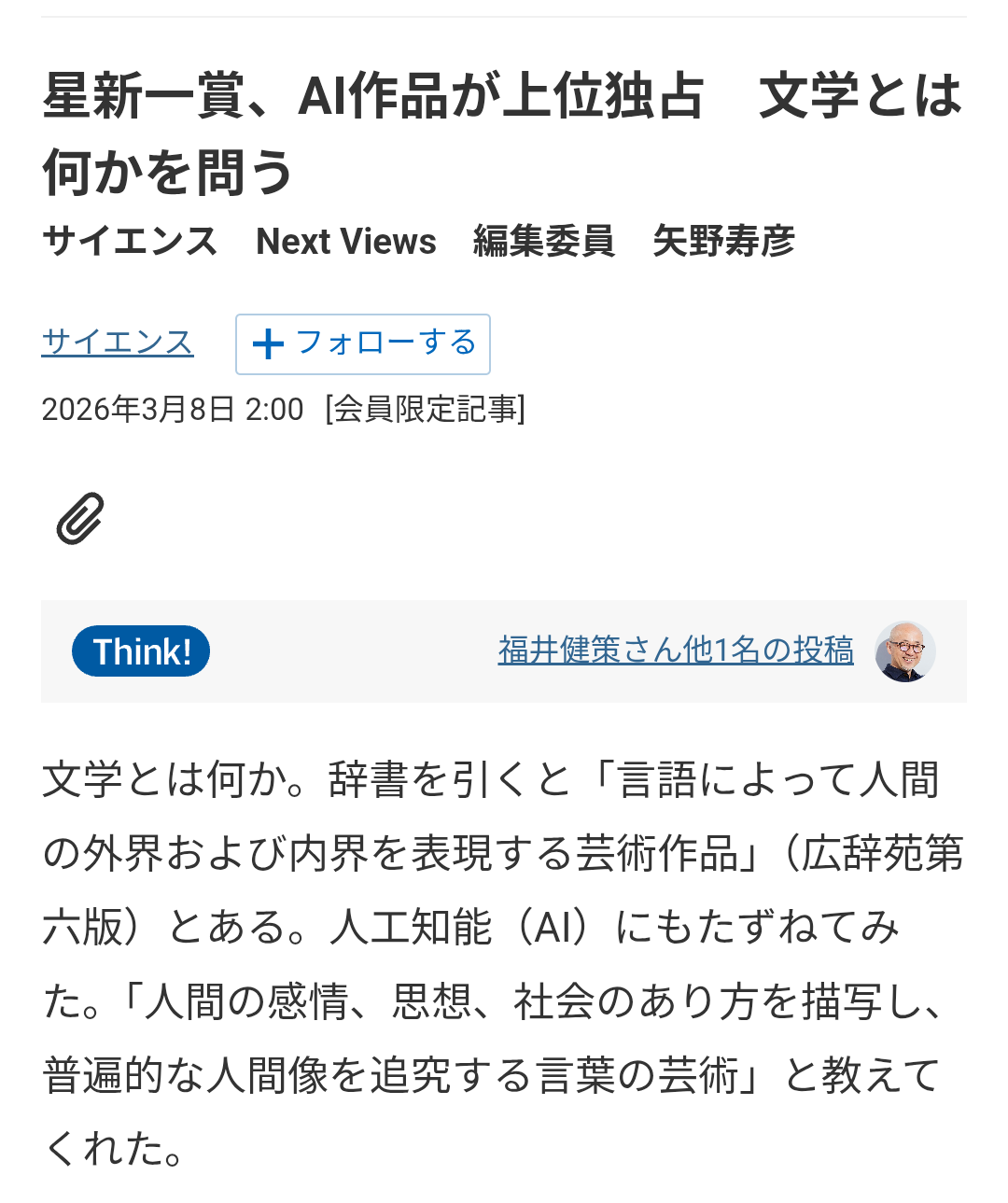 | … | 626/03/15(日)06:54:56No.1410857378そうだねx31見極めるべきはAIかどうかじゃなくて小説の良し悪しじゃねーの |