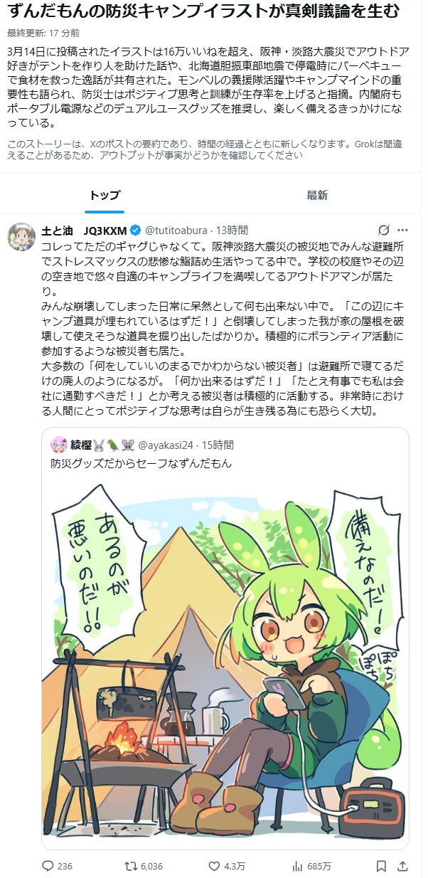 | … | 4926/03/15(日)10:43:05No.1410904235そうだねx3>震災の周年タイミングで盗んできた防災グッズでくつろぐ様子をイラストにすればそりゃ燃えるって話 |