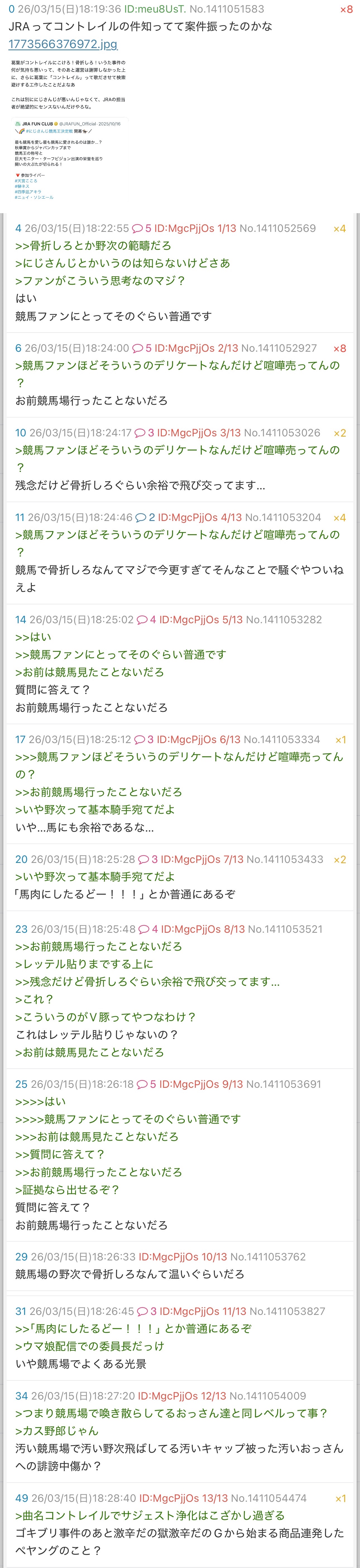 | … | 58526/03/15(日)19:45:05No.1411082289+>>>Vの何かの争いするのは自由だけどさすがに無関係な競馬ファンを馬鹿にして貶めるのはやめてほしい |