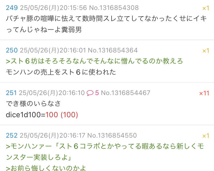 | … | 45026/03/15(日)19:49:25No.1411084032+>急に統失できンチがハッスルし始めたけど誰かこいつ負けさせたの? |