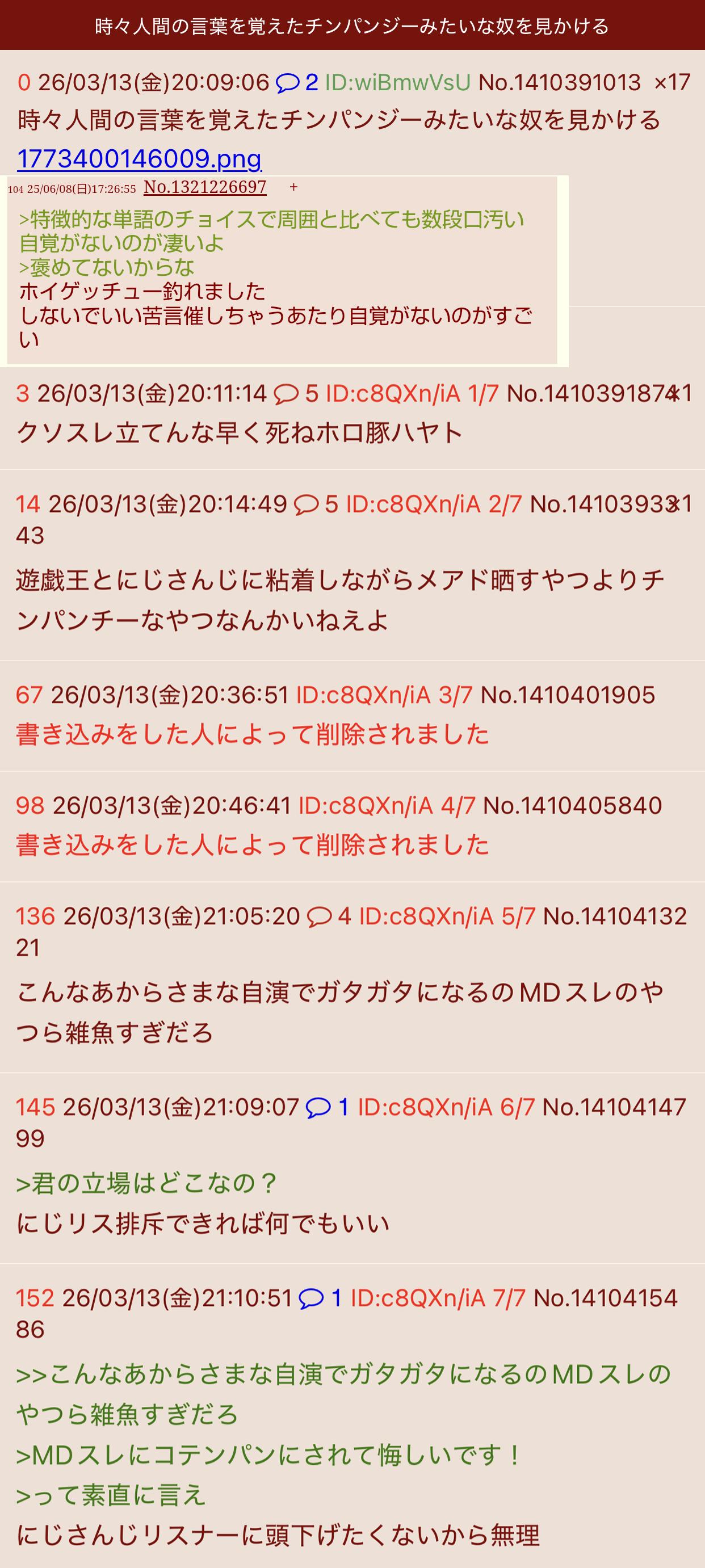 | … | 6126/03/15(日)20:08:58No.1411092232そうだねx2MD以外にも節操なく色々粘着してるからお前の悪行は結構知られてる |