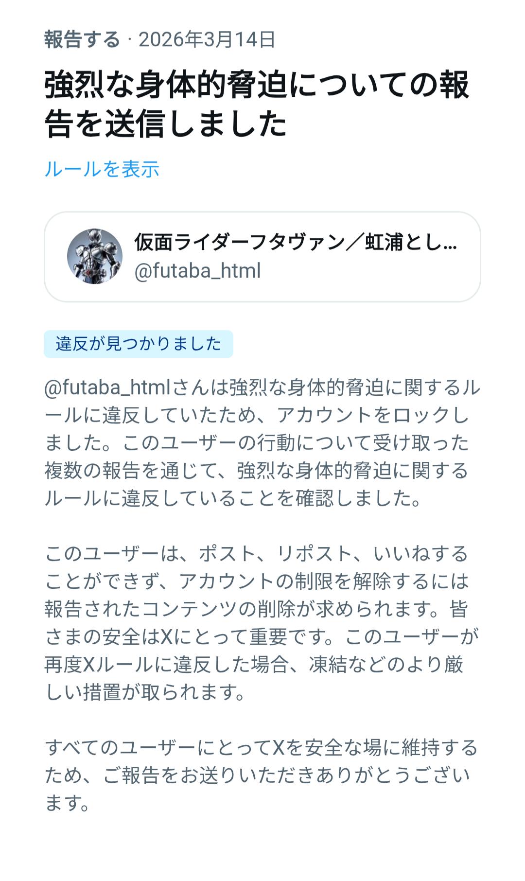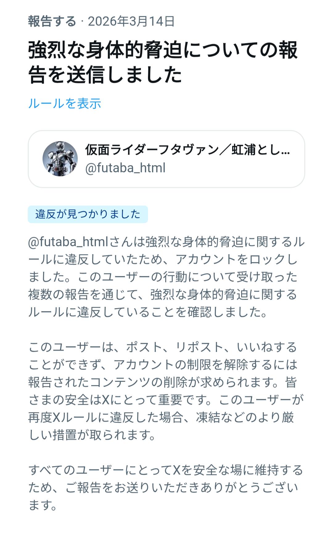 | … | 8626/03/15(日)23:20:21No.1411163453そうだねx5>凍結されたやつが新しいアカウント作るのって規約違反なんすよ |