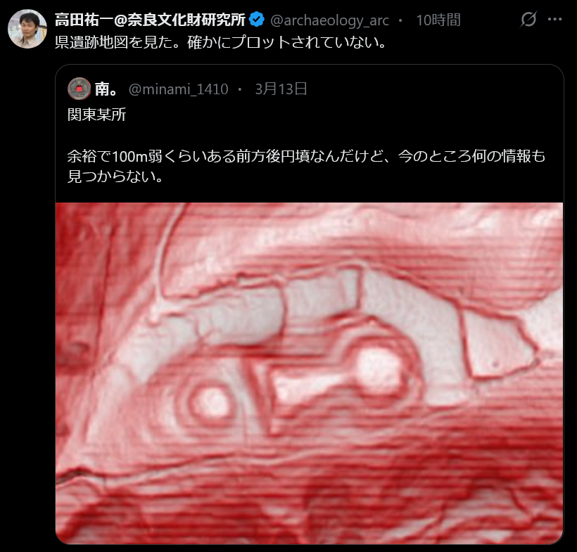 | … | 7826/03/15(日)22:43:19No.1411151046そうだねx3人の目線から見たら丘か山だし上から草木を除いた状態で見ないとわからんわな |