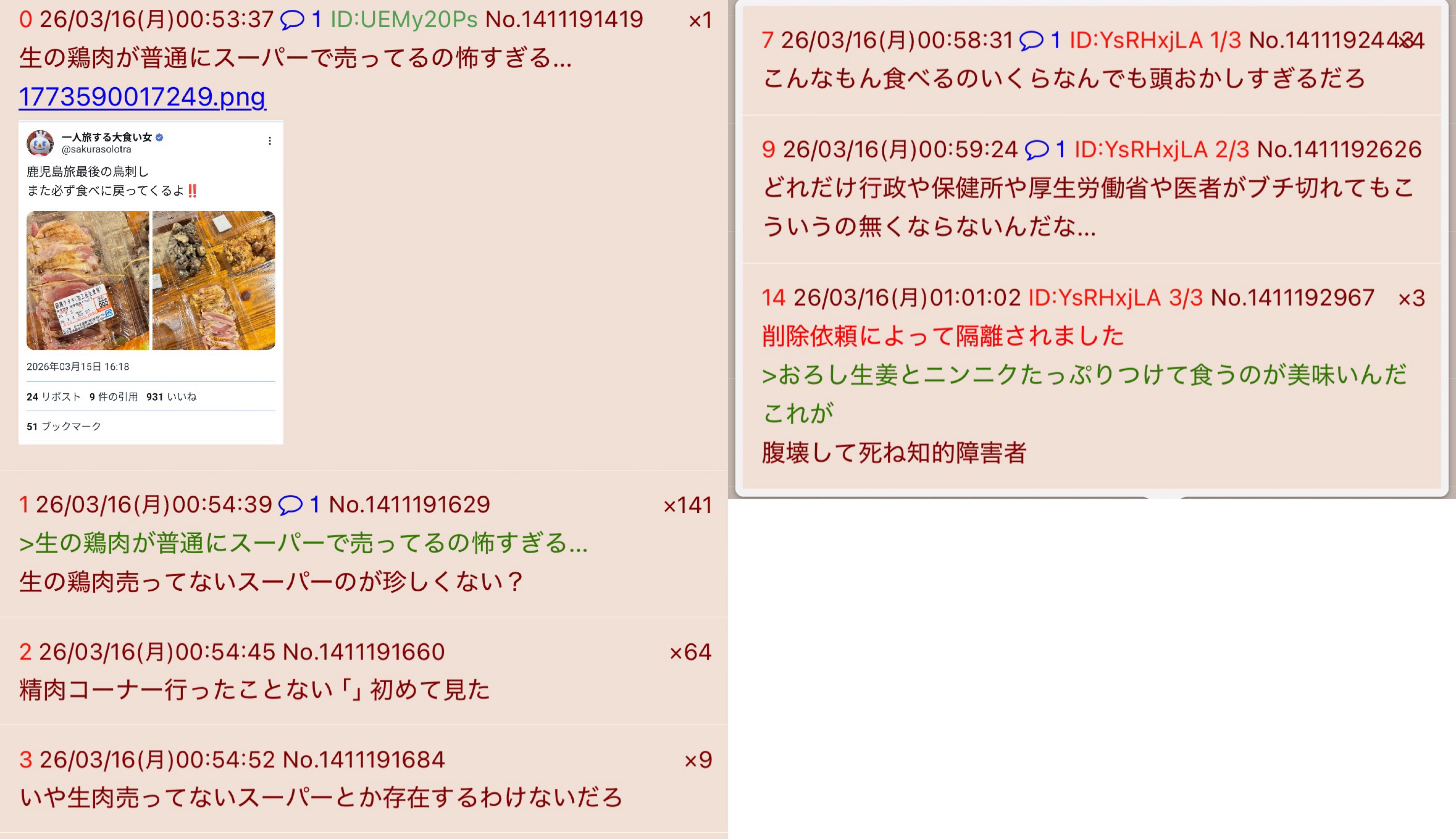 | … | 4026/03/16(月)01:10:28No.1411194790そうだねx1>鶏の生食の話になると発狂して噛み付いてくる奴が居着いてるよねimg |
