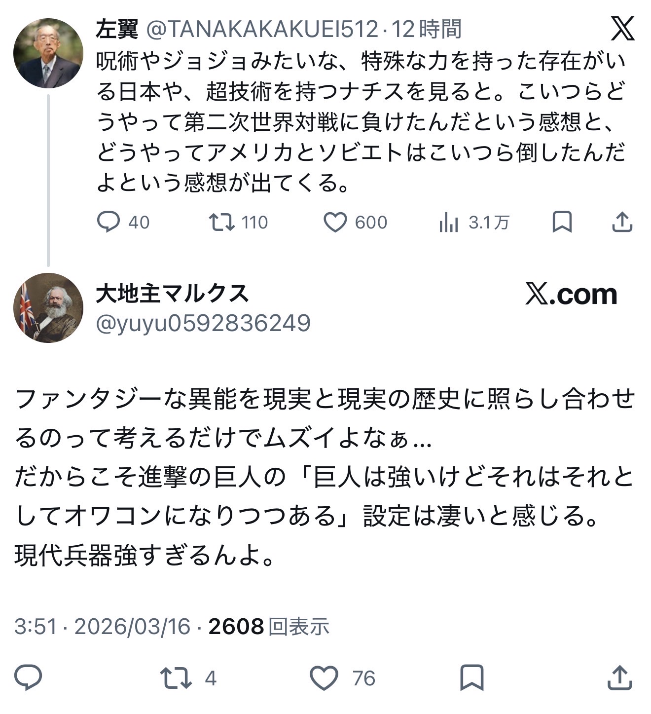 | … | 2426/03/16(月)17:20:46No.1411330176+>左翼とマルクスの会話ってだけで笑いがこみ上げてくる |