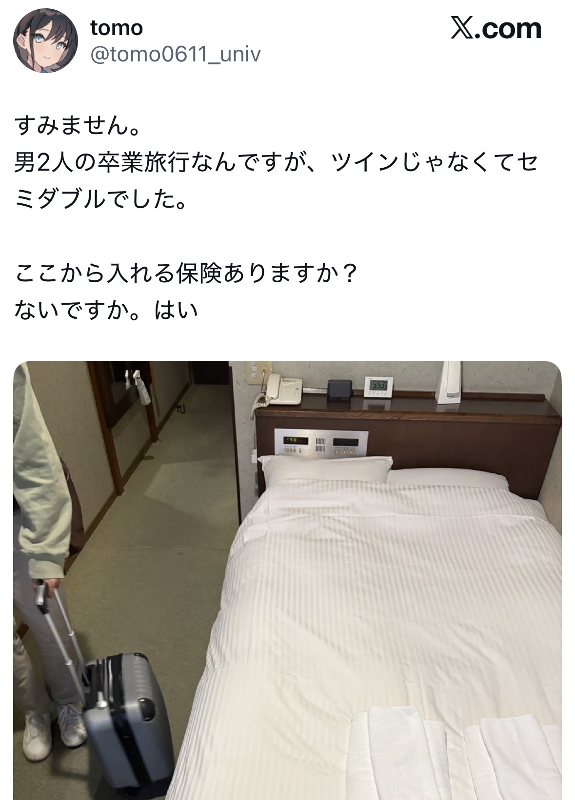 | … | 4026/03/16(月)22:49:52No.1411454275+ツインでもベッドがビッチリ寄せてあっていや実質ダブルですやんってホテルもある |