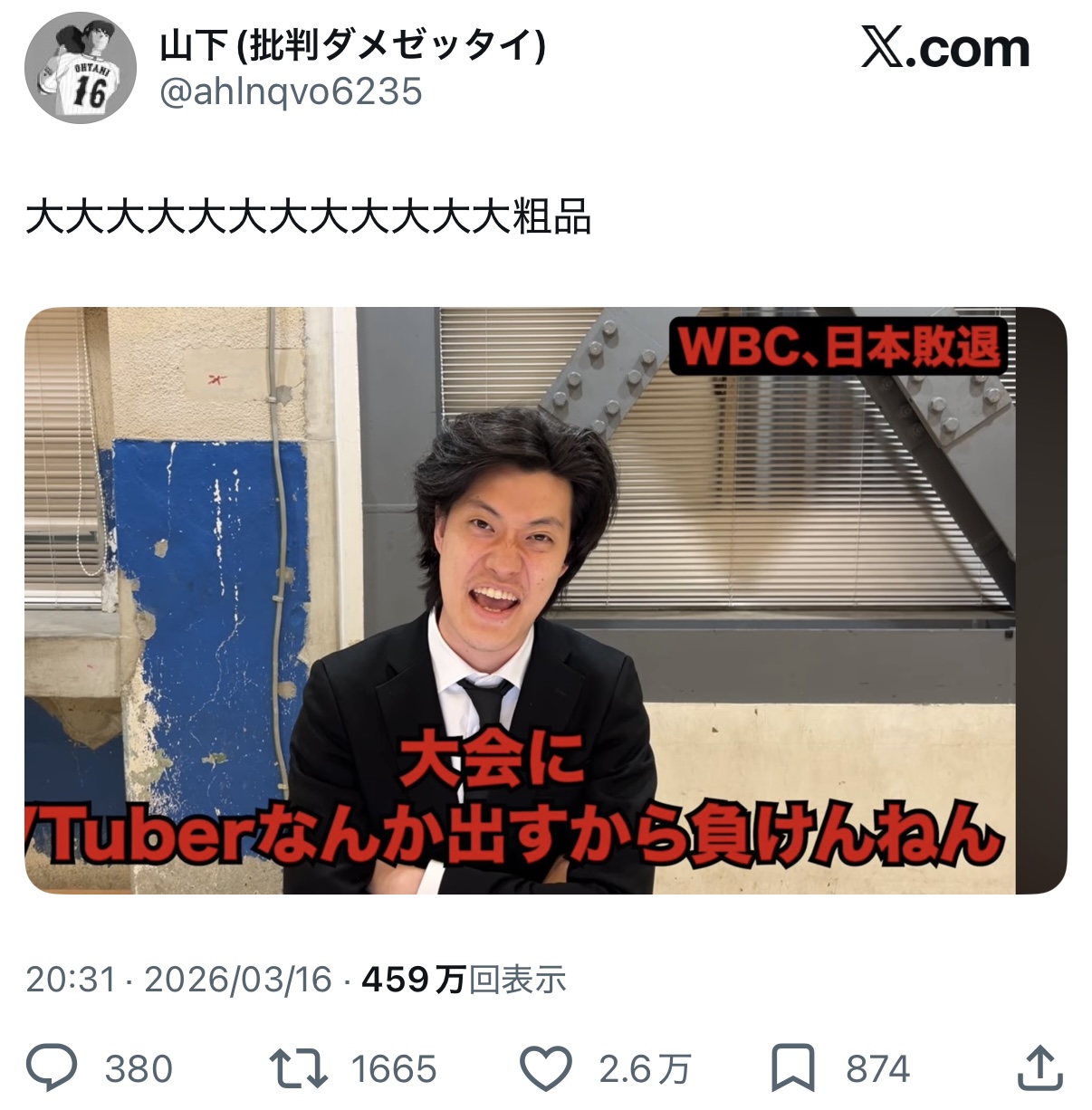 | … | 9626/03/17(火)01:35:01No.1411500504+>お仲間には大ウケだろうけど一般人や野球ファンははぁ?としかならんだろ |