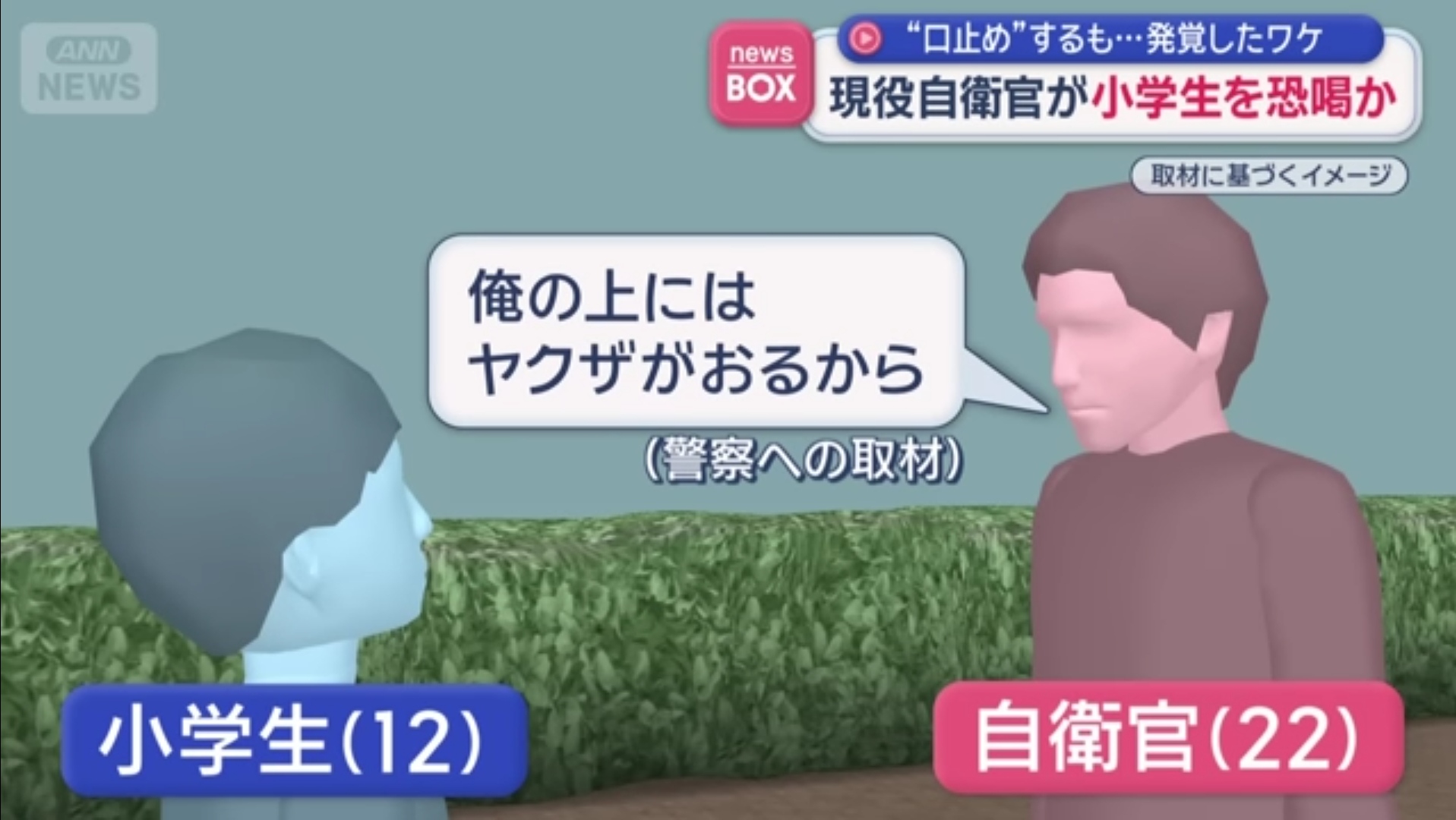 | … | 7126/03/17(火)08:38:22No.1411528206そうだねx112歳の小学生を脅したとみられるのは現役の自衛官(22)。 |