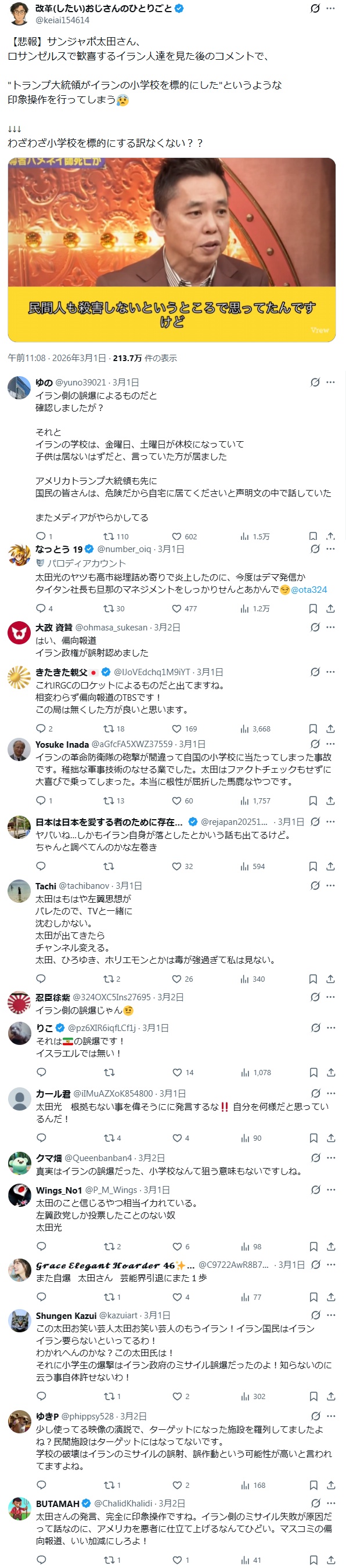 | … | 18326/03/17(火)17:17:59No.1411640372+>イラン小学校のイラン革命防衛隊の誤爆デマは北村晴男も信じてたってのがびっくりした |