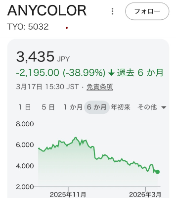 | … | 726/03/17(火)20:33:50No.1411701069そうだねx1【悲報】エニーカラー、株価暴落🐖💩【にじさんじ】 |