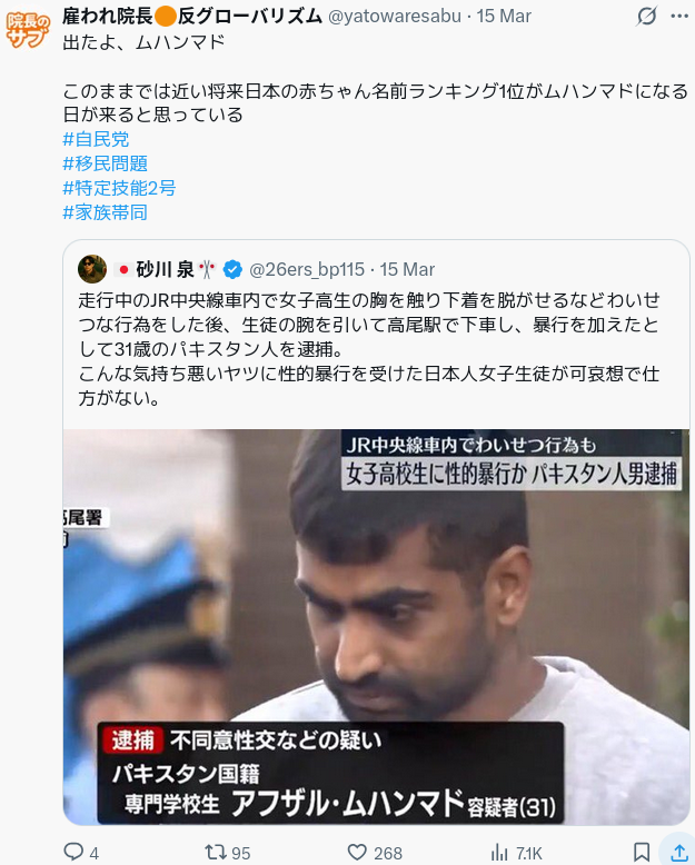 でもなんで外国人が犯罪を犯したら名前の事まで揶揄しだすんだ?排外主義を超えてそんなのもうファシズムでしょうよ