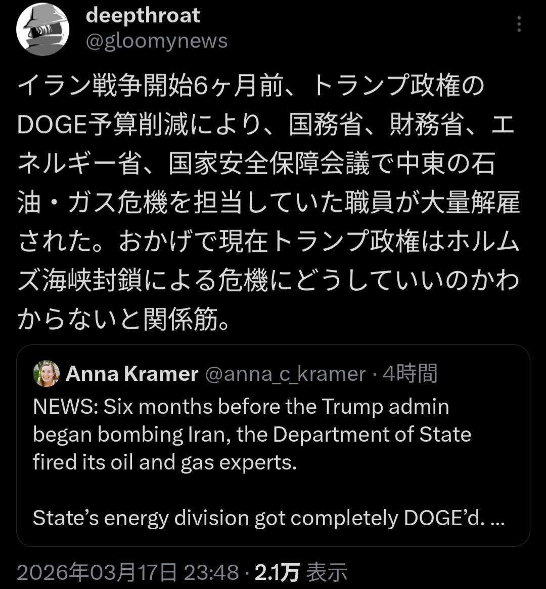 | … | 2026/03/18(水)06:18:33No.1411806861そうだねx12日本では嫌がらせになってるけどアメリカでは違うかもしれないし… |