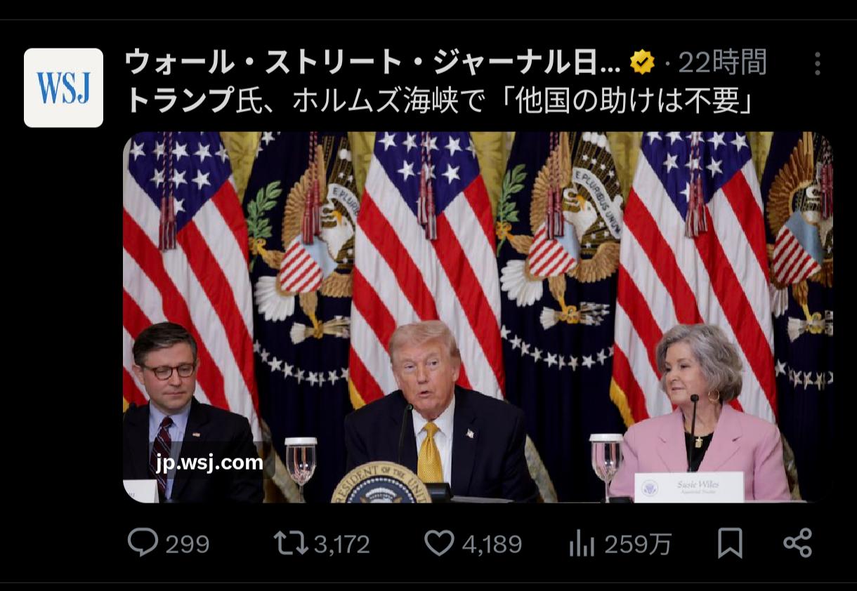 | … | 3226/03/18(水)06:23:34No.1411807070そうだねx13>トランプさんが今までアメリカに助けてもらった国がアメリカが困ってる時には助けてくれないって言ってる |