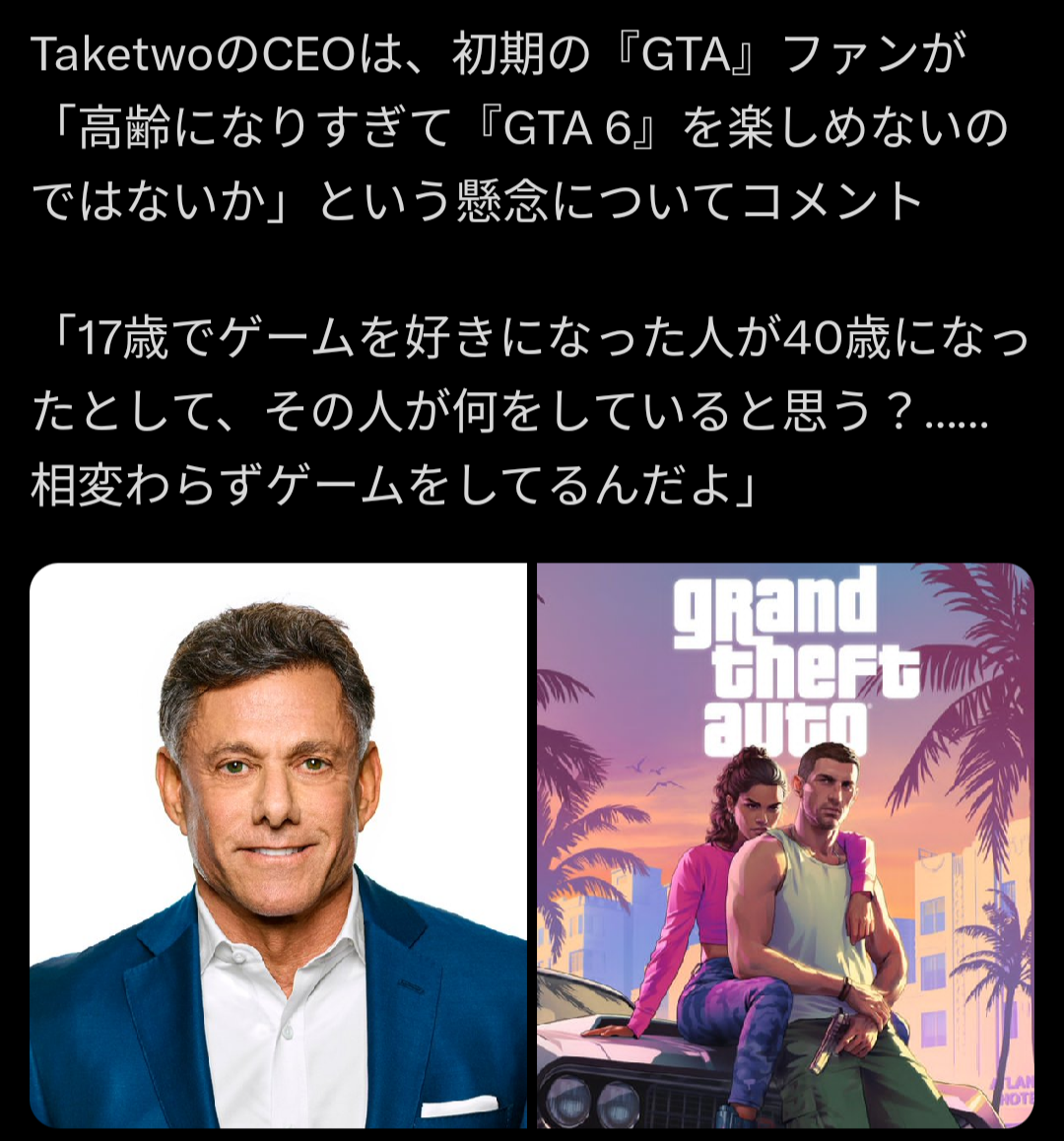海外のゲーム遊んでる人間の年齢層で一番多いのが30代だから40代も同じようにゲームしてるよね