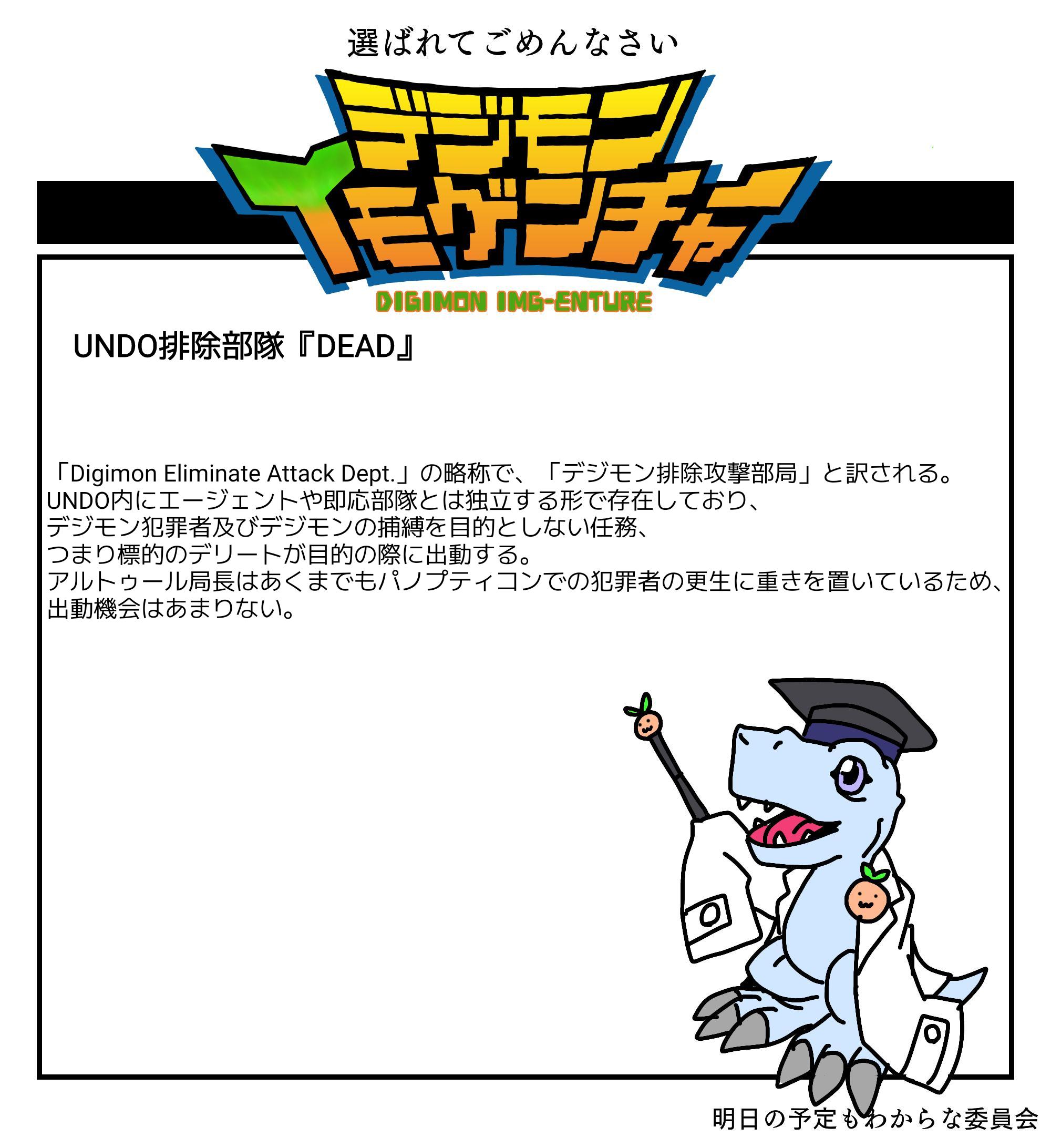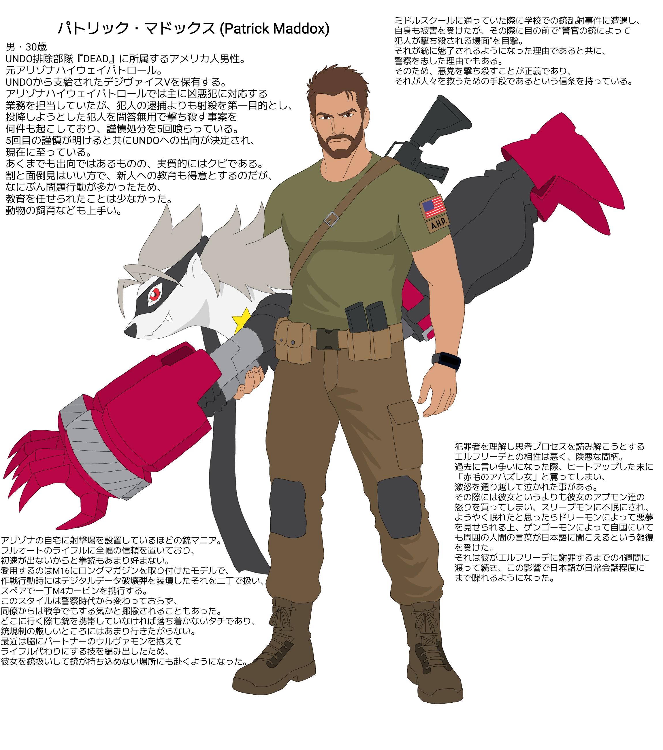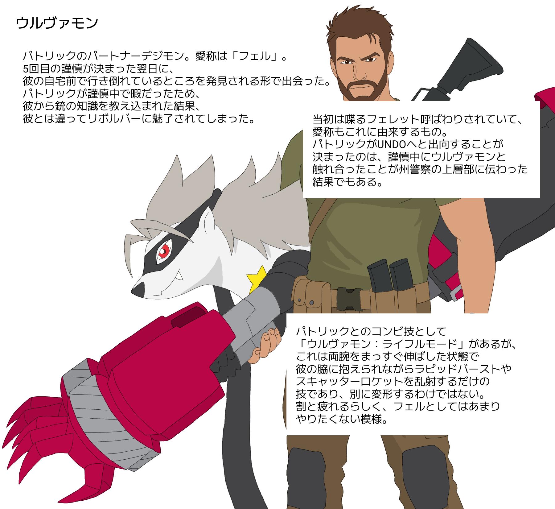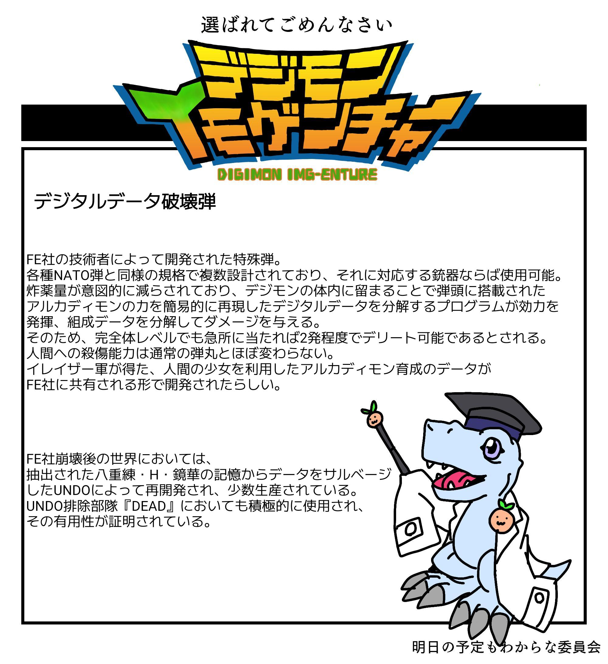 | … | 626/03/18(水)21:18:51No.1412005499+>DEADのアクロニムを思いつく→雑談してたら過激なアメリカ人を思いついたのでせっかくだからまとめる→設定はできたけど銃描けねぇ→そうだデジモンを銃にすれば描かなくて済む上にデジモンもまとめられる |
