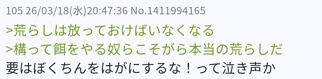| … | 6026/03/18(水)21:38:41No.1412012954+粘着荒らしは麻薬ですね |