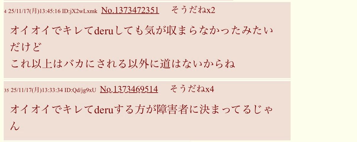 | … | 5826/03/18(水)21:38:23No.1412012832そうだねx1今まで以上にバカにされるってわかってるのにどうしてまた立てちゃったの? |