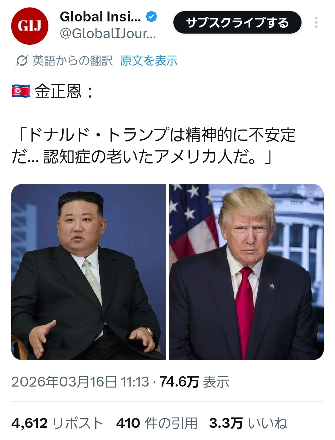 | … | 2026/03/19(木)00:19:35No.1412068796そうだねx5相対的に北朝鮮と中国がまともな国家に見えるバグ |