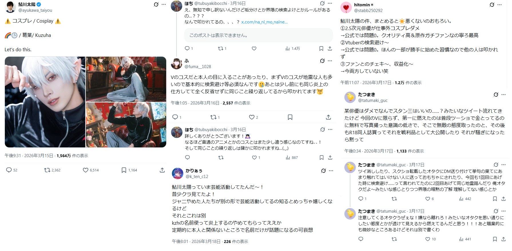 | … | 1226/03/19(木)02:42:09No.1412091743そうだねx1>ホロやぶいすぽのコス自撮りならV本人がリポストしてクオリティ高ーい!可愛ーい!ではしゃいでるのにどうしてこうなっちゃうんだろうな |