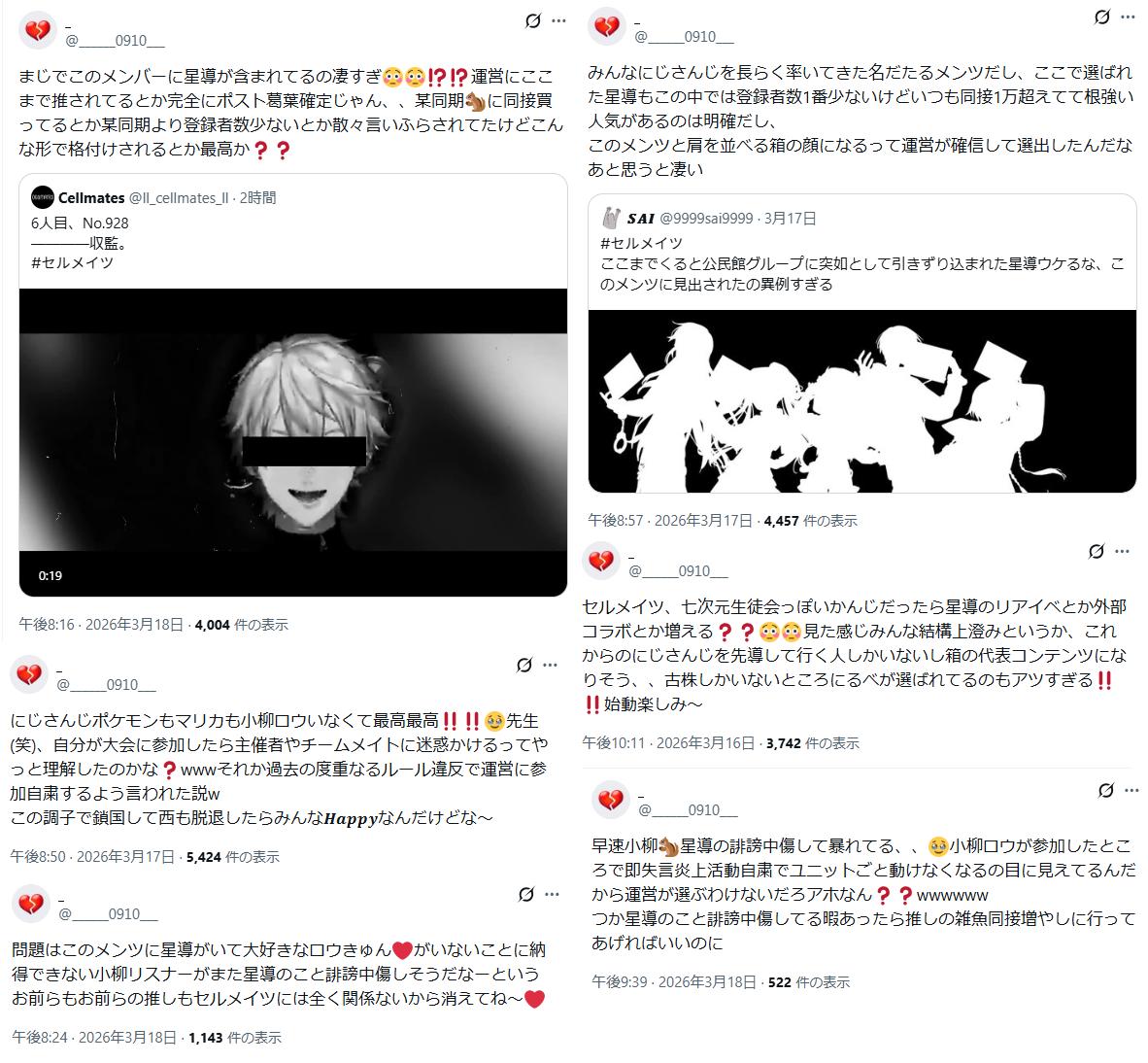 | … | 3926/03/19(木)07:11:44No.1412103163そうだねx3>>にじさんじリスナーさんこそこそとっちーでハヤトなんてタグ付けしているのゴキブリみたいだね |