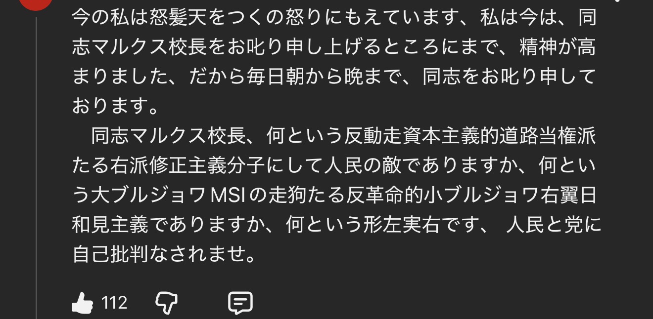 | … | 3426/03/19(木)10:37:20No.1412132820そうだねx6>カタブルジョワによる案件テロルに屈し資本主義に傾倒した右派修正主義 |