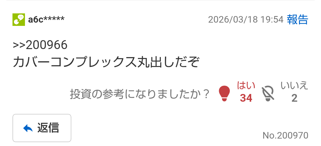 | … | 2626/03/19(木)12:30:26No.1412158308そうだねx4自社の下げ幅どころか上げ幅すら意に介してない相手にマウント取るのどうかしてる |