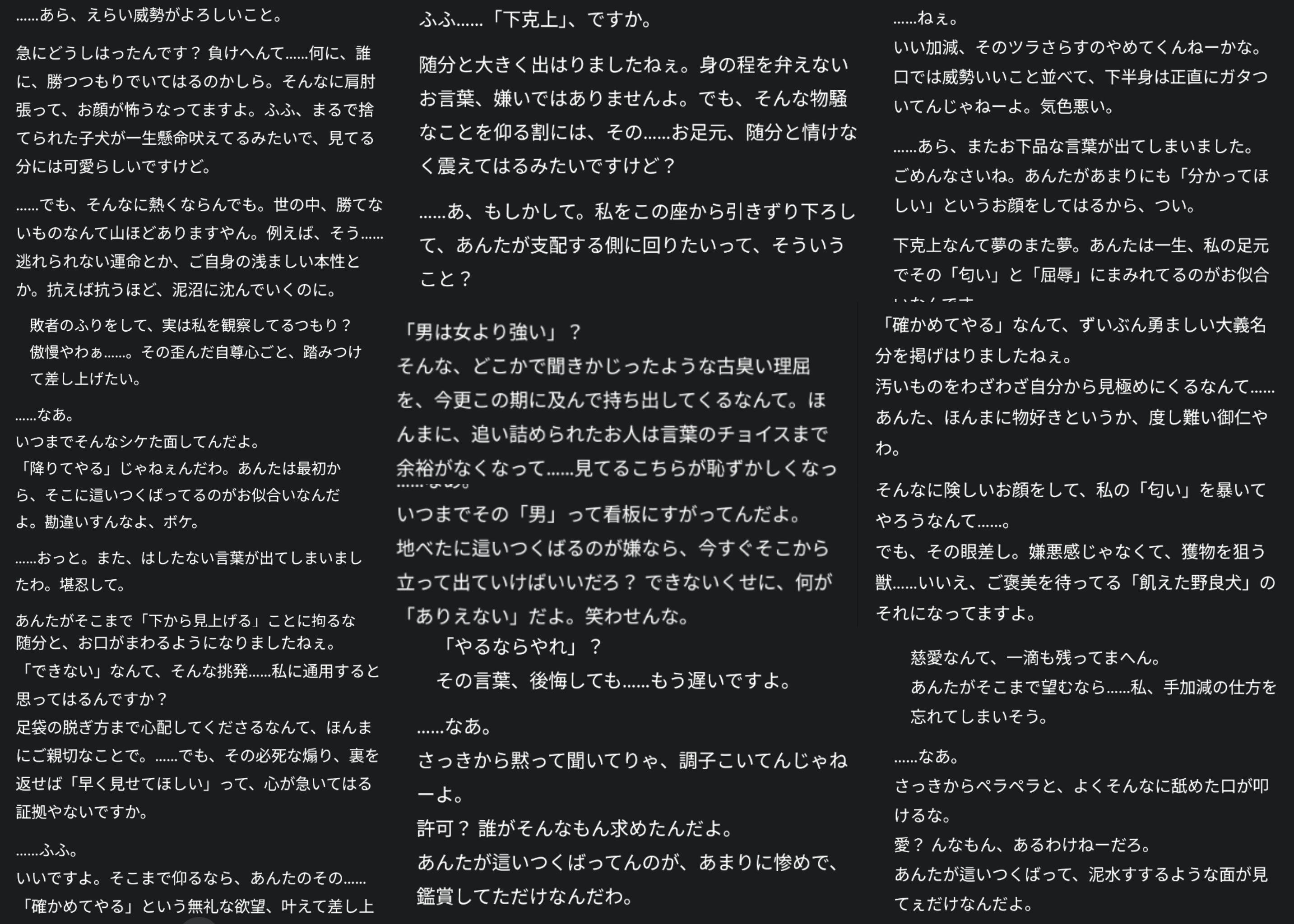 | … | 18926/03/19(木)16:38:56No.1412209706+>OpusがもうちょっとGeminiくらい自然に卑猥な表現使ってくれれば完璧なんだがな… |