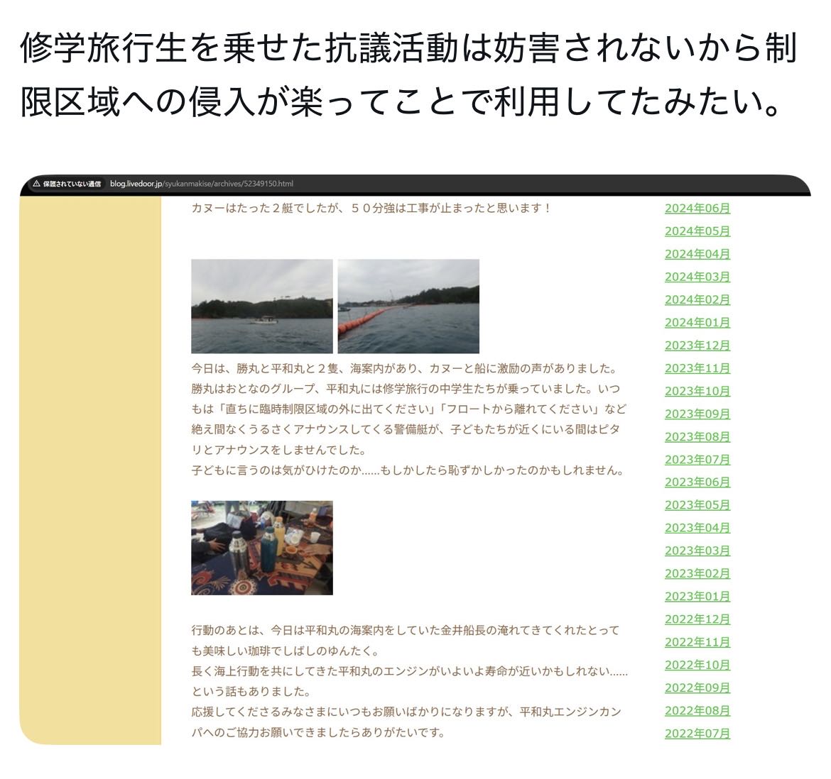 | … | 7426/03/19(木)18:50:27No.1412241772そうだねx1>>・学校側は「辺野古移設に反対する人の船」と説明し「活動家の船」と説明していない |