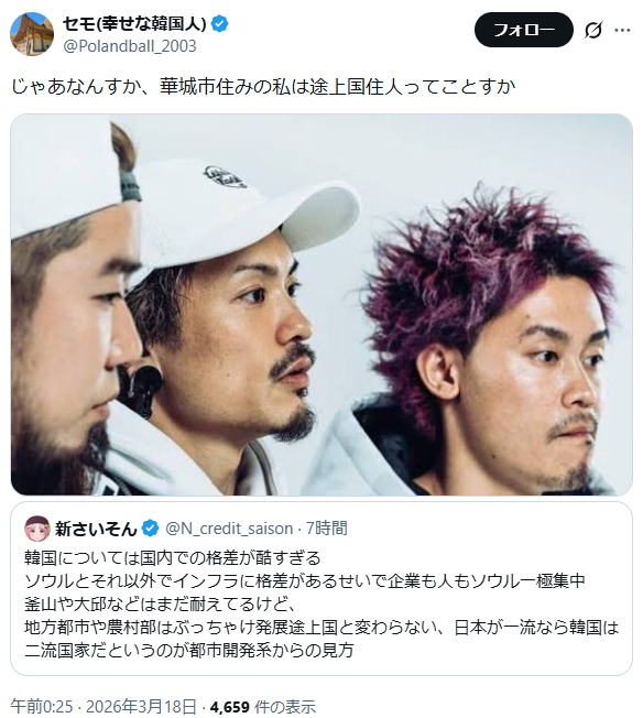 | … | 826/03/19(木)19:18:48No.1412250162そうだねx3日本が一極集中になんたら言うのはブーメランでしかないだろ |