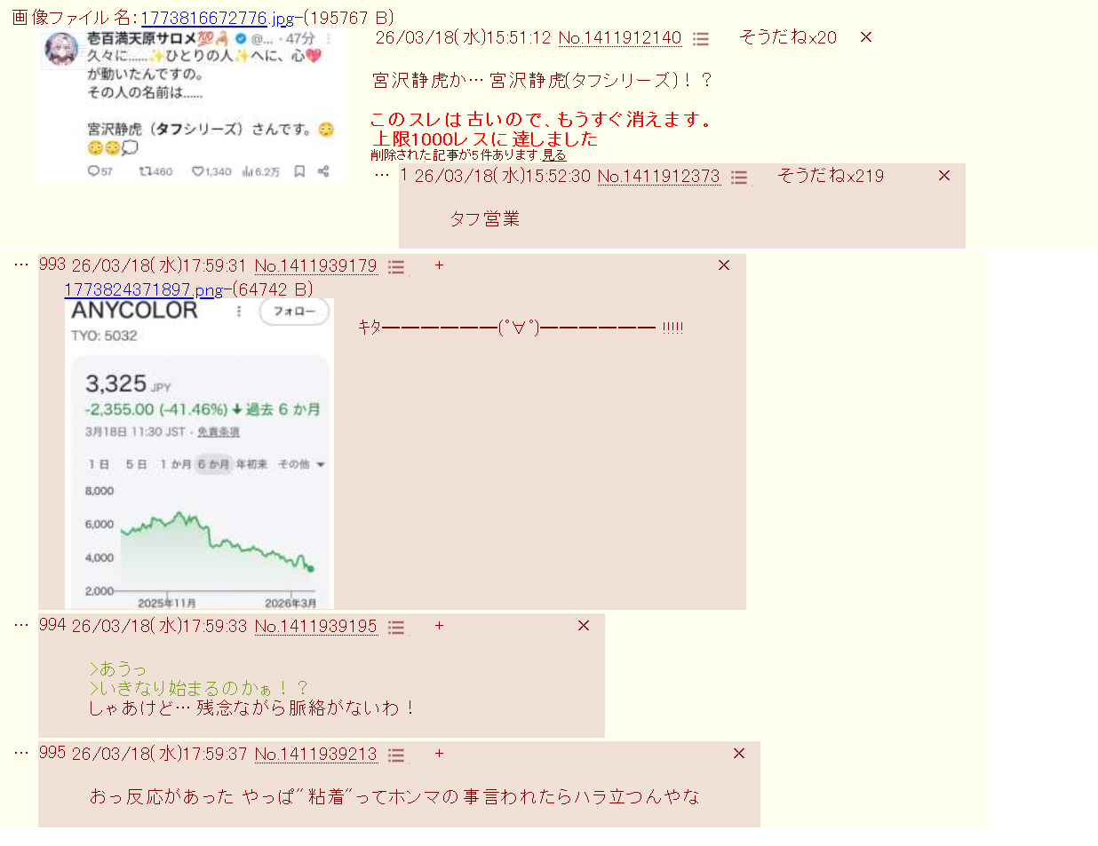 | … | 4326/03/19(木)20:41:38No.1412277862+>3000を下回るのも時間の問題じゃねこれ |