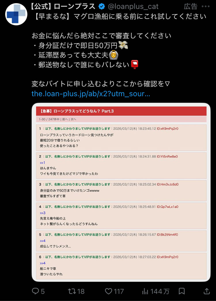マグロ漁師が50万を内緒で即金で欲しい延滞歴ある奴以下の扱いなの差別すぎるでしょ