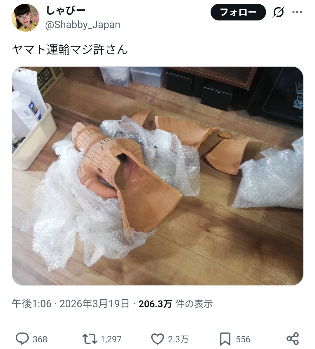 | … | 1726/03/20(金)04:32:43No.1412384823そうだねx19こんな割れ物をこんな簡易梱包で送っといてヤマトのせいにするのは無理でしょ |