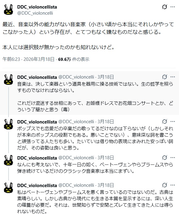 | … | 21226/03/20(金)15:05:30No.1412489651そうだねx1>>スレ画は音高音大出の音楽一筋の音楽バカが社会経験ないのにズレた政治や世論を語ってるの見て、音楽一筋はバカだなーって言ってるポスト |