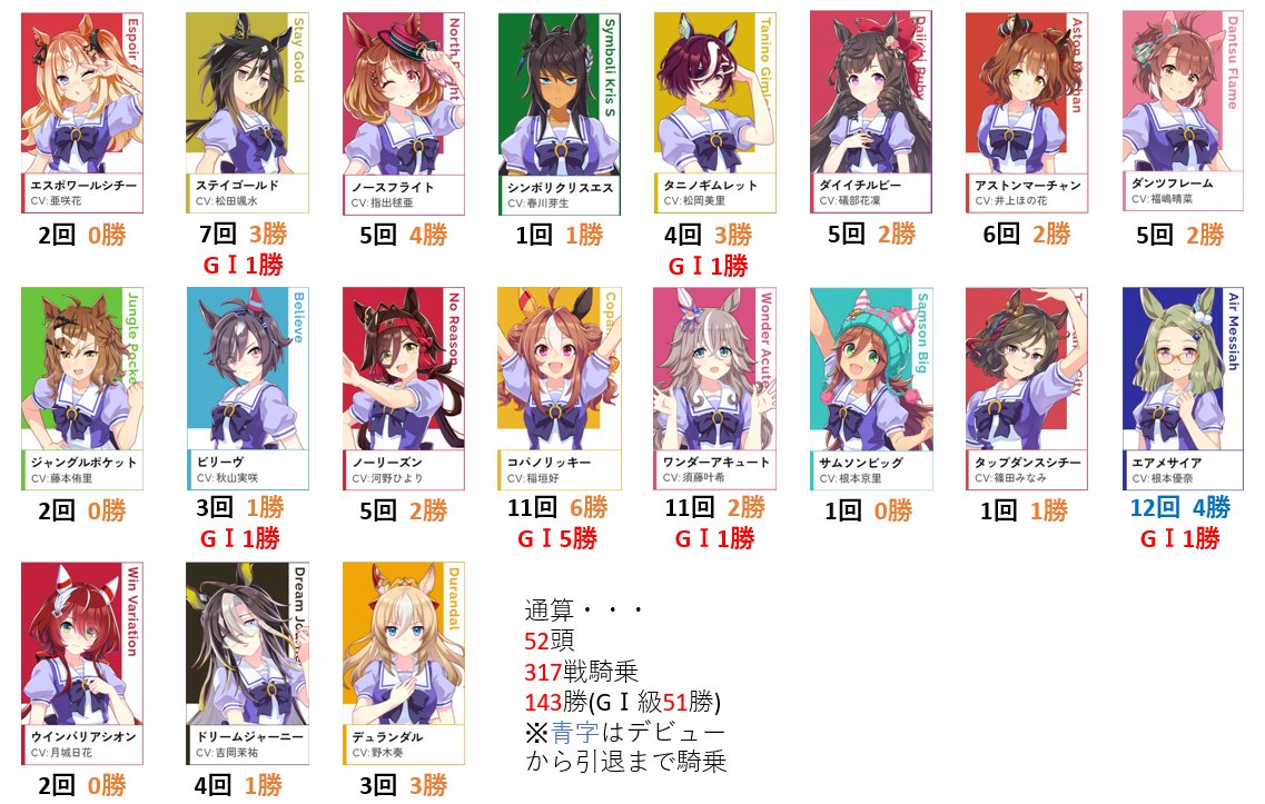 | … | 726/03/20(金)13:10:55No.1412459926そうだねx1制作上の都合による詰め込みはともかく実際実績あるやつトレーナーに集まるのは自然なことだしな |