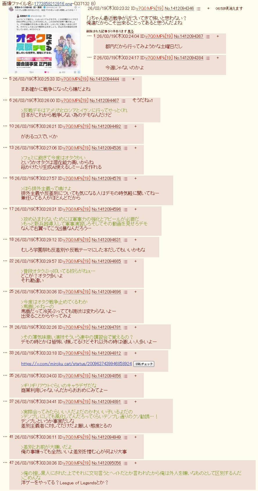 | … | 6326/03/20(金)13:01:08No.1412457016+ここでも街宣活動してる最高に気持ち悪い |