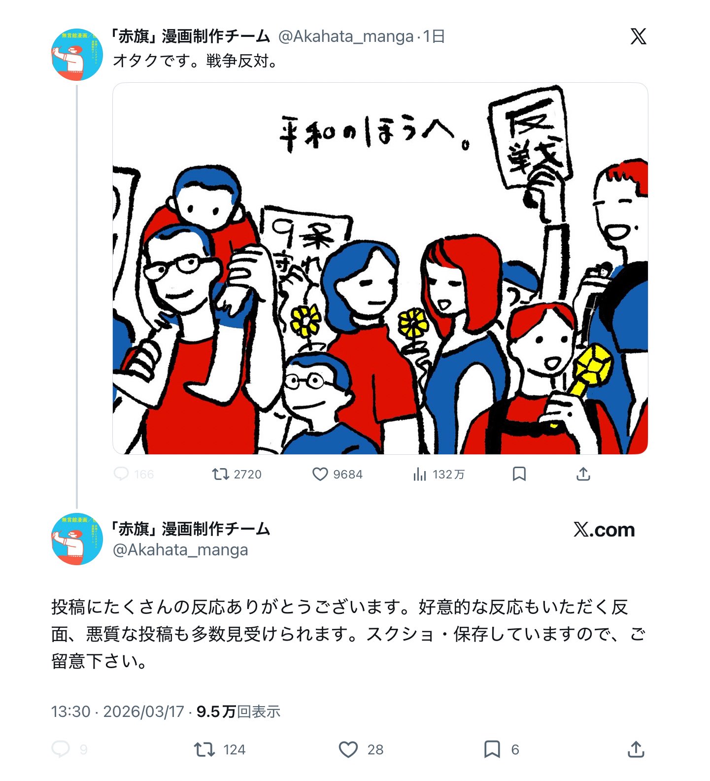 | … | 1126/03/20(金)12:25:58 ID:a4CngqNcNo.1412447268+戦争反対や今の政府へのデモを呼びかけるようなイラストや漫画ふえたね |