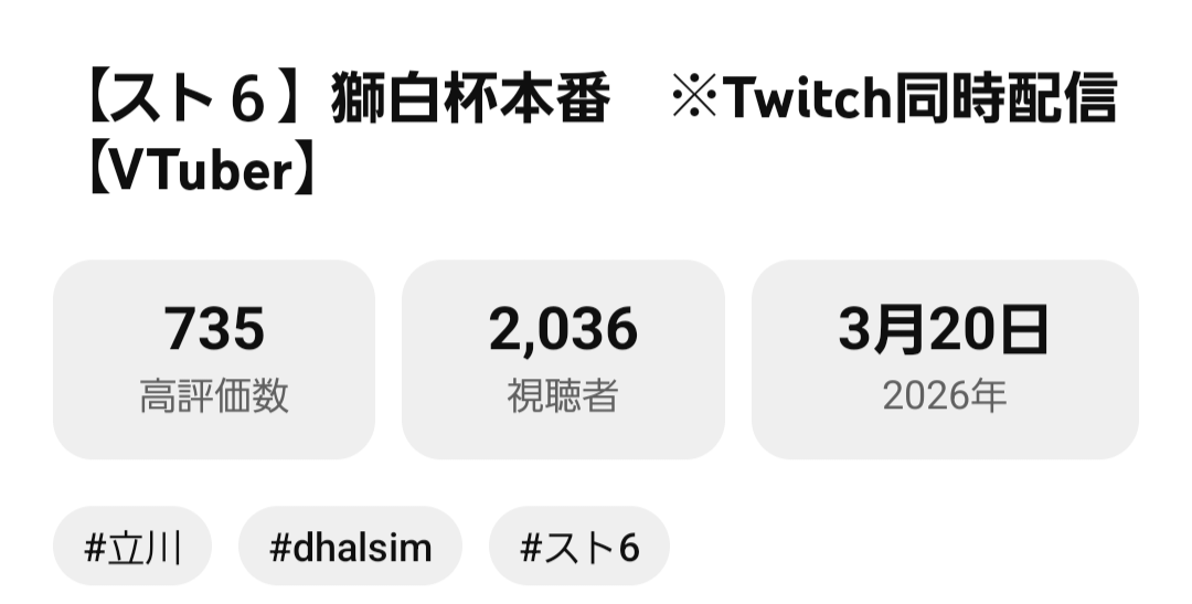 | … | 95026/03/20(金)18:15:28 ID:utcrNdq2No.1412536441そうだねx13>ばぶ太郎獅白杯終わったらみんな見てくれなくなることに恐怖してます |