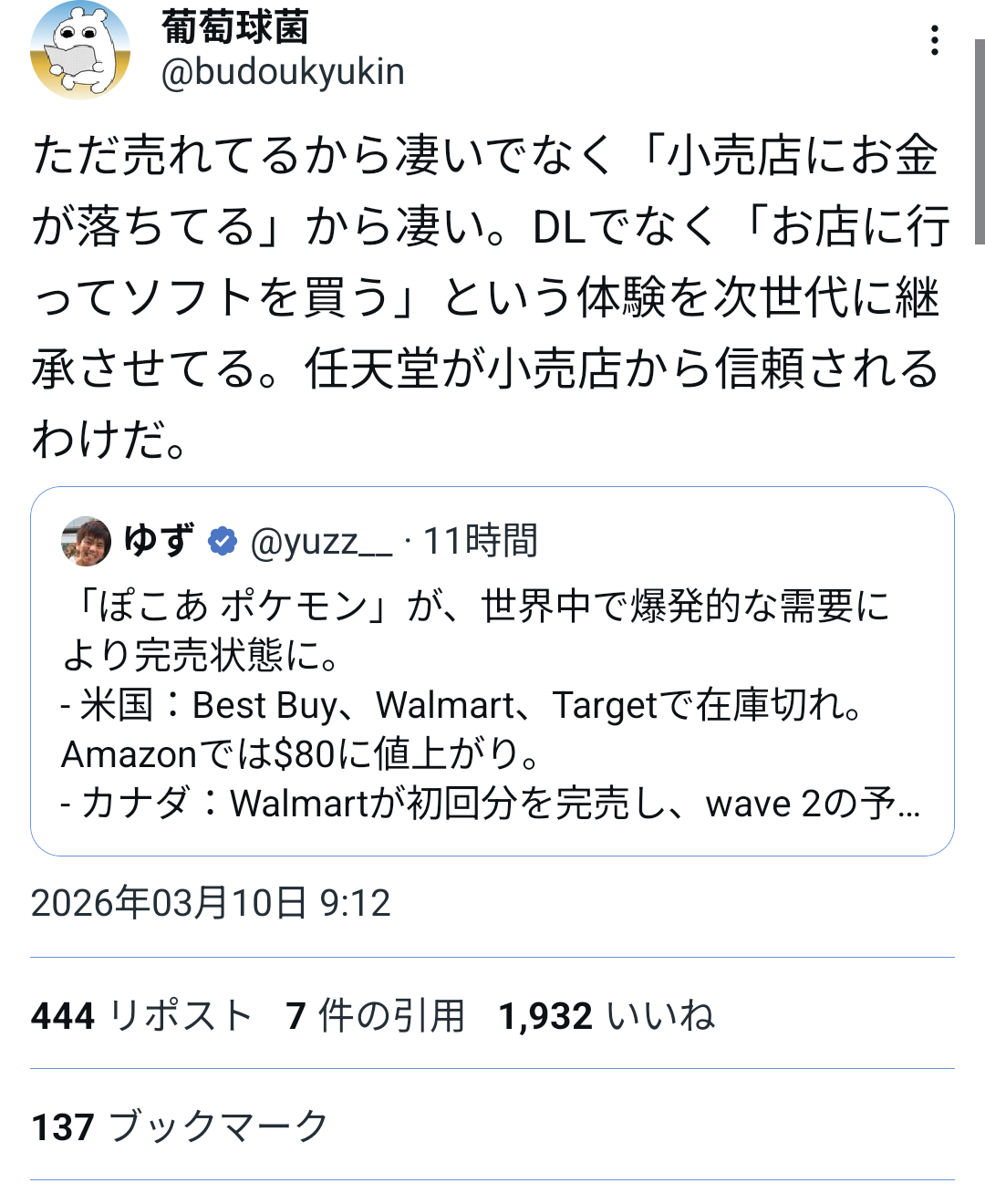 | … | 6126/03/20(金)19:46:58No.1412568646そうだねx1別に特別な売り方してるわけでもないんだからポケモンが人気で凄いって話でしかないと思うんだよな |