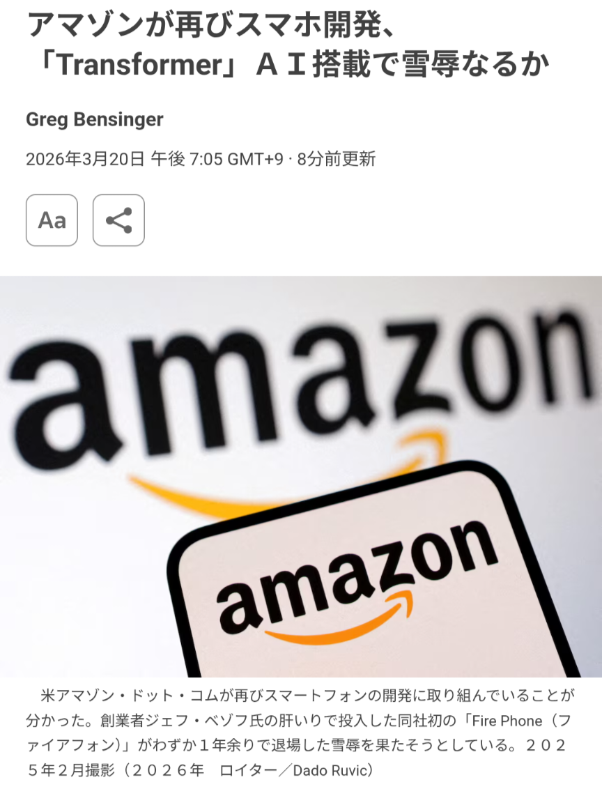 | … | 2326/03/20(金)19:40:09No.1412565957そうだねx3>新スマホは、音声アシスタント「アレクサ」と連携し、日常的にアマゾンとユーザーをつなぐ「モバイルパーソナライゼーション端末」を想定。アマゾンの電子商取引サイトでの購入、プライムビデオの視聴、プライムミュージックの再生、アマゾンが提携する食品宅配グラブハブへの注文などをこれまで以上に簡単に利用できるようにする機能が搭載される見通しという。 |