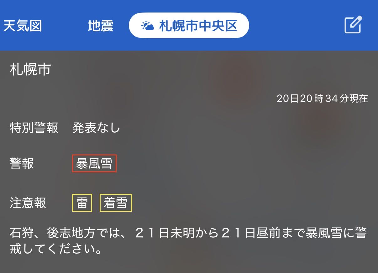 | … | 84726/03/20(金)21:01:25No.1412599729+>>札幌は今も暴風雪警報出てるんぬ |