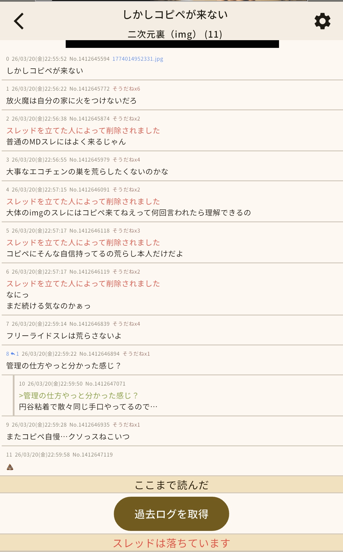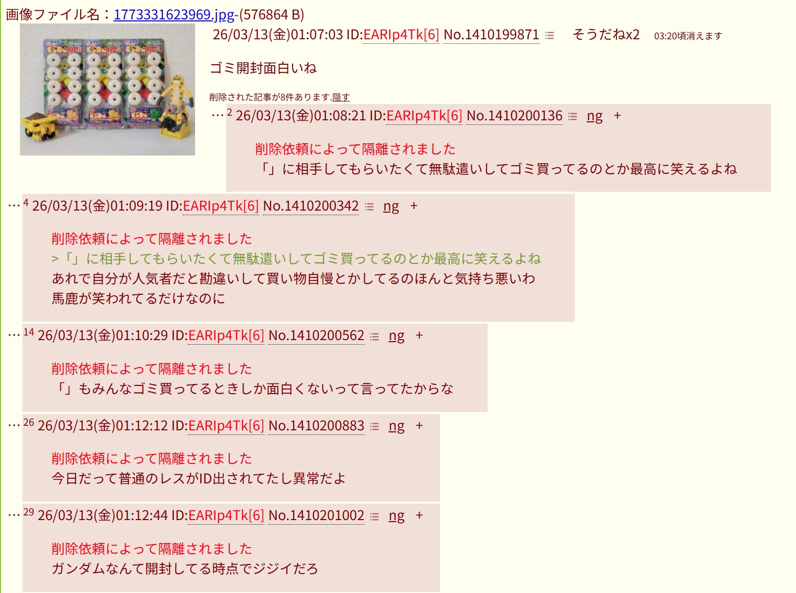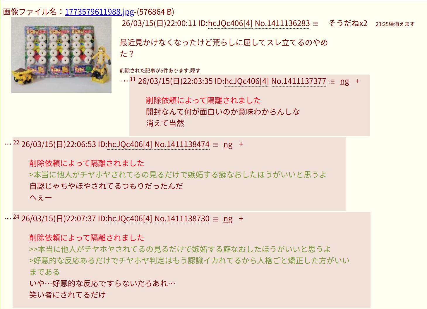 | … | 5426/03/21(土)01:09:22 ID:oU8ydbO2No.1412686882そうだねx3>スレッドを立てた人によって削除されました |