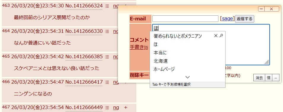 | … | 6326/03/21(土)01:23:55 ID:03/XqHQYNo.1412690096+まんこ |
