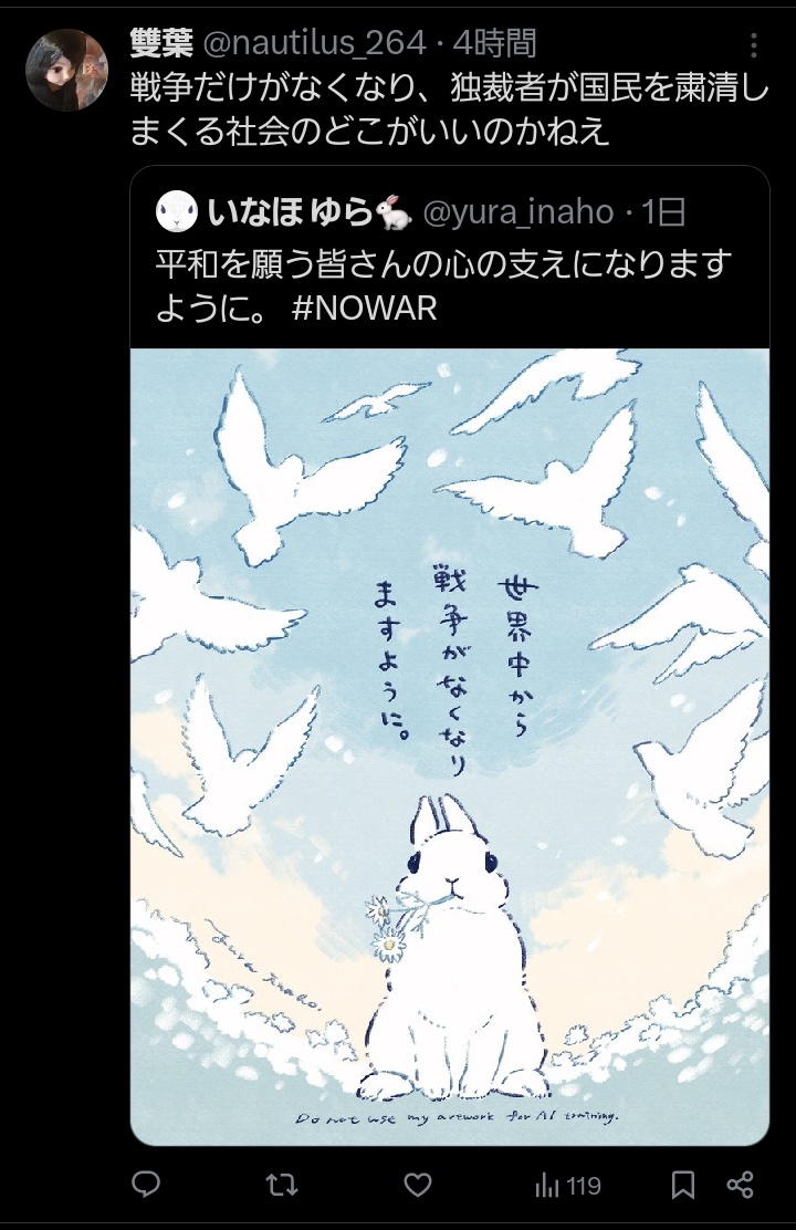 | … | 2526/03/21(土)10:12:09No.1412739611+>反戦を表明することに反日要素無くない? |