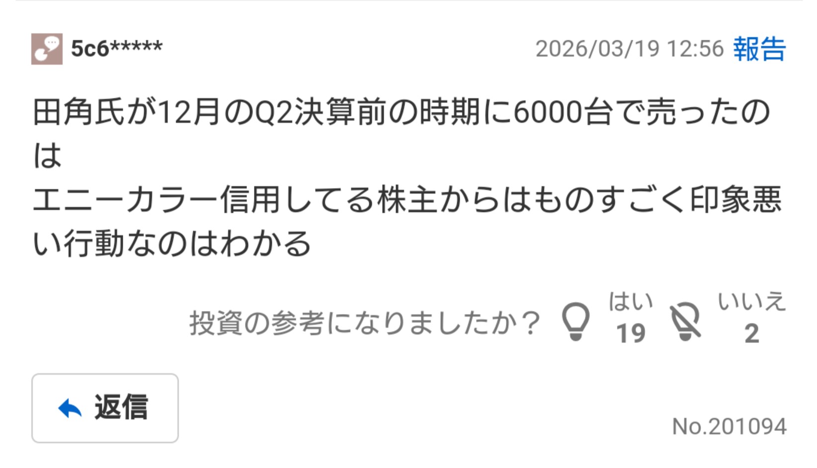 | … | 2526/03/21(土)10:27:18No.1412742362そうだねx17>実際反転含めてアンチを減らす努力をしないままどれだけ吊っても無駄だと思う |