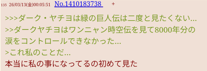 | … | 6126/03/21(土)12:04:29No.1412764184そうだねx42周目映画館でキメてきたけど味わい深くなりすぎるだろヤッチョ… |