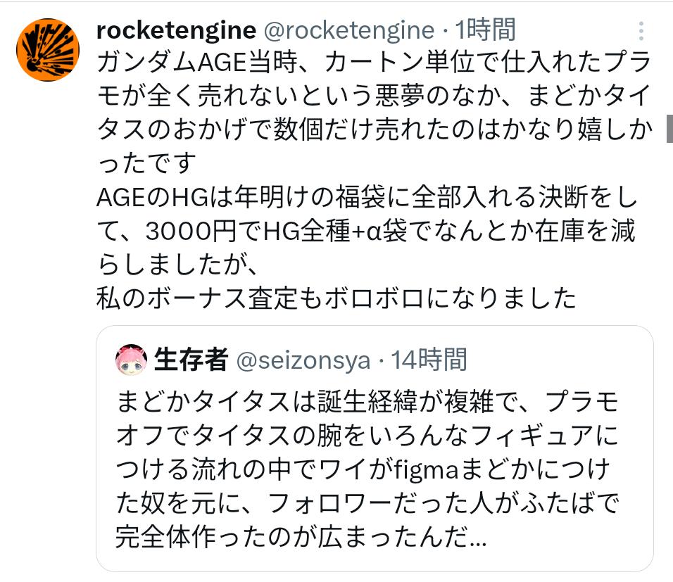 | … | 1226/03/21(土)12:20:29No.1412768049そうだねx3AGEも2世代目からはプラモちゃんと売れてた記憶 |