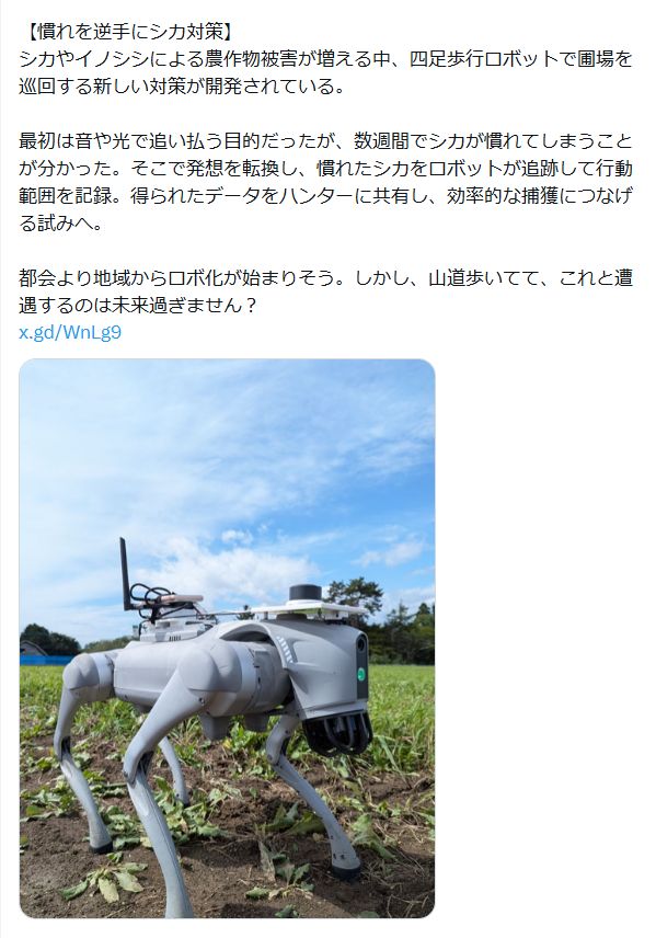 | … | 3126/03/21(土)15:13:06No.1412816671+鹿が慣れて近づいてきたところをブスッと刺すとか…ロボットが武装すると人も危ないからダメか |