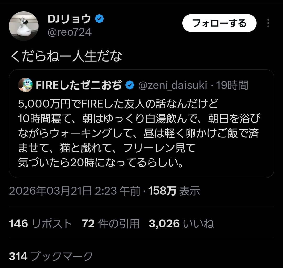 | … | 4026/03/21(土)15:30:21No.1412821294そうだねx14アーリーリタイアしたいと思うほどバイタリティのない人はアーリーリタイア出来るほど若いうちに稼げないって無情だよな |