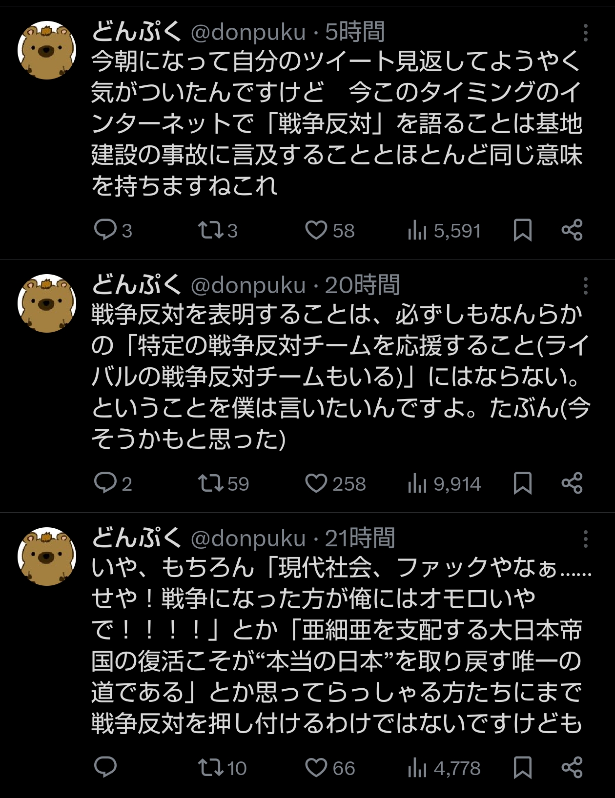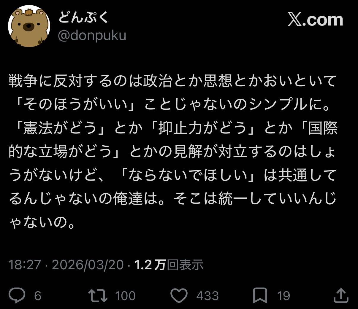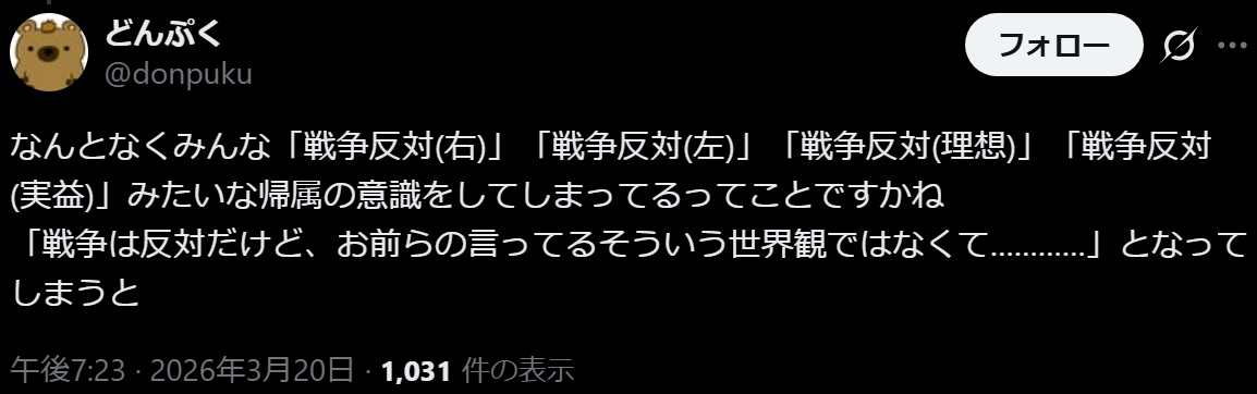 | … | 1526/03/21(土)16:27:30No.1412836326そうだねx98戦争に反対するだけであっち側扱いって |